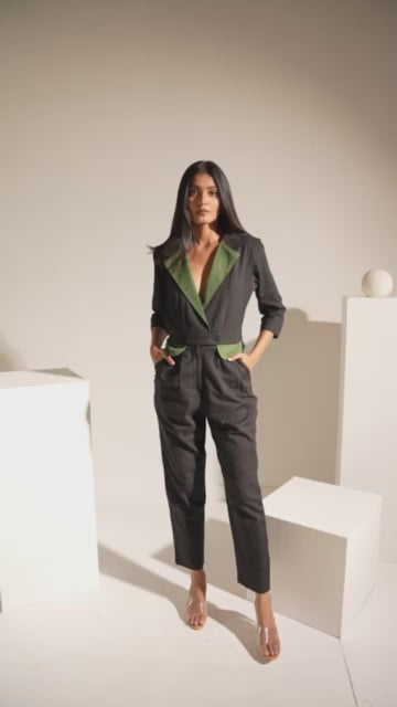 Alivia is the crown piece of our collection, the minimalist black jumpsuit with lapeled collar and adjustable waist band and a hint of military green makes all body types look flattering and oh so lovely, Pair it with your favourite black boots and get ready to bask in compliments.