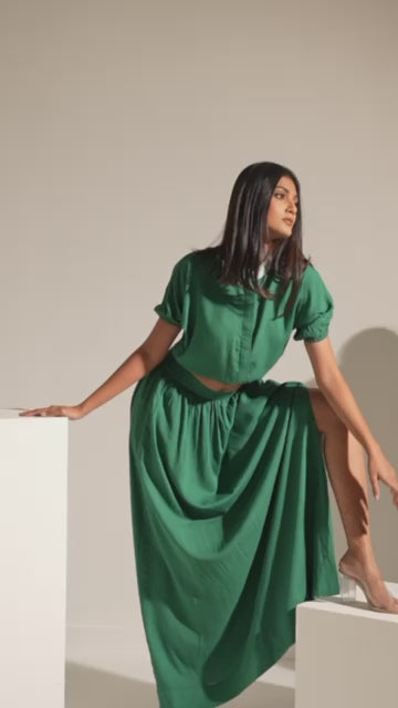 Kylie is a co-ord set with a cropped top elasticated on the waist to sit wherever you'd prefer with a long skirt with a side slit. Get ready to raise temperatures with class on your next brunch date or an evening out with your girls.